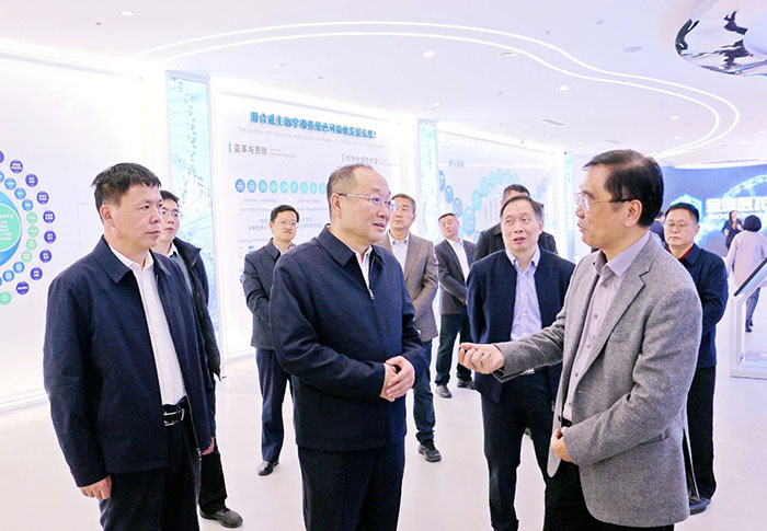 在“金城合成生物学智创空间”科技展厅,李涛详细了解了金城合成生物学、医药健康产业及企业发展情况。集团董事长赵叶青介绍了金城医药产业布局及合成生物学等产业板块发展现状。